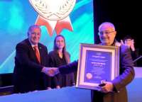 | פרופ' פרץ לביא מקבל את עיטור יקיר חיפה מראש העיר חיפה יונה יהב. צילום ניר בלזיצקי דוברות עיריית חיפה |