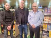 | חגי שלום קובע את המזוזה בכניסה לסניף טיב טעם ברחוב מחניים 4 בחיפה. לצדו בתו רואת החשבון חן שלום כהן ונכדתו אנה כהן. צילום רונית קיטאי |
